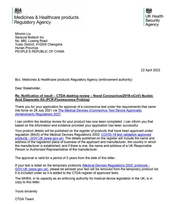 新冠检测试剂在英国上市必须经过CTDA审查和MHRA注册双认证,由于CTDA审查对产品性能的高要求,目前可在英国合法销售的新冠产品并不多。yabo.com生物新型冠状病毒(2019-nCoV)核酸检测试剂盒(荧光PCR法)临床性能和分析性能均满足CTDA高要求,且得到进一步有效验证,获得了CTDA的充分认可。